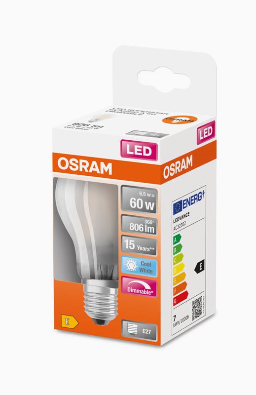 OSRAM LED-lampa Normaali MATTA 7W/840 (60W) E27. Himm.eä. Osramin LED-lamppujen avulla saat energiatehokkaan lampun, joka tuottaa hyvän valon ja hyvän värintoiston, ja lamput, jotka näyttävät klassisilta hehkulampuilta ja halogeenilampuilta.